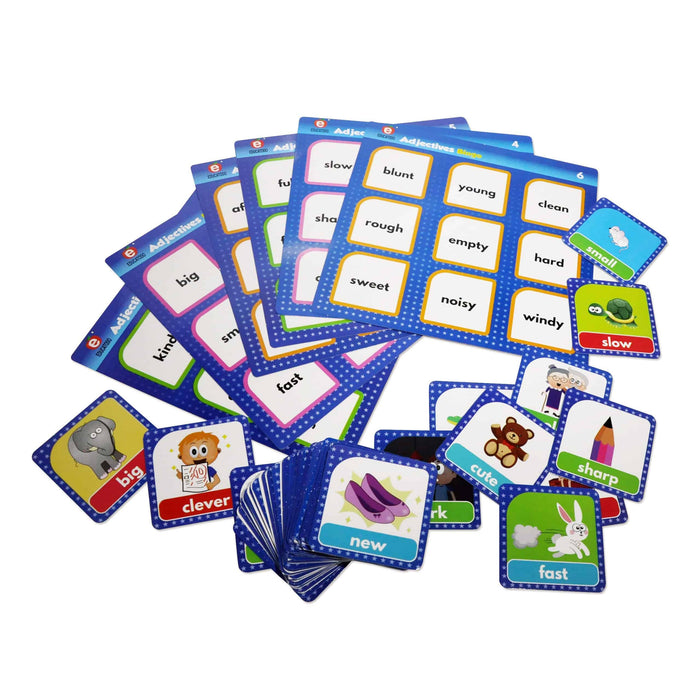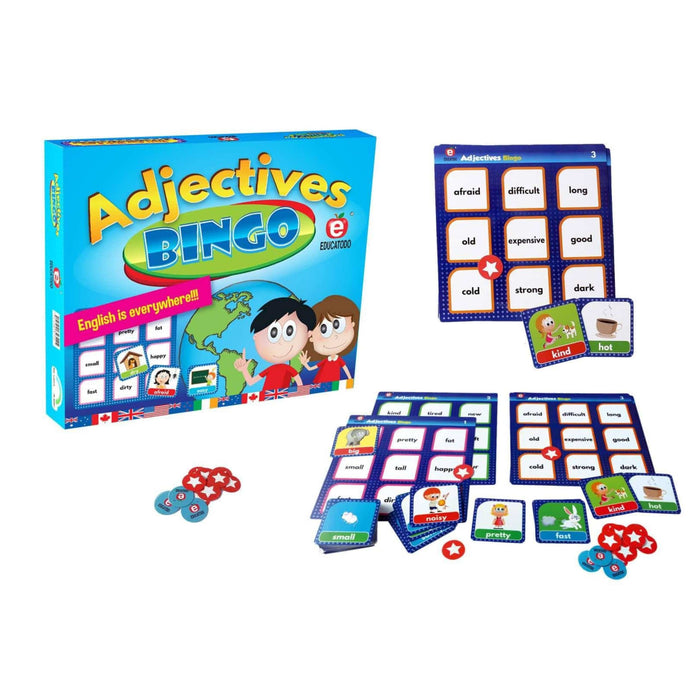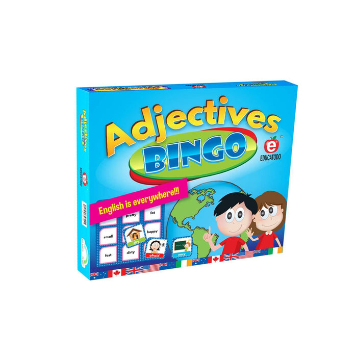 Con Adjectives Bingo las niñas y los niños podrán entretenerse mientras conocen el idioma inglés por medio de imágenes y sus respectivas palabras. Aumenta su vocabulario en ese idioma así como su capacidad de atención y concentración. Amplía la capacidad de observación y discriminación visual.