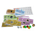 Contiene: Un tablero con medidas de 109 x 74 cm aproximado, impreso en selección de color en tela plástica, con 6 tiendas diferentes: Tienda de ropa, la papelería y de regalos, tienda de juguetes y deportes, tienda de música, de electrodomésticos y subentiende. Monedas desprendibles elaboradas en plástico laminado con las siguientes denominaciones de $10.00, $5.00, y $1.00.(en total 200), billetes de diferentes denominaciones con un animal y su respectiva cantidad que representa: Leon ($500.00), Elefante ( $200.00), Gorila ( $100.00), Rinoceronte ($50.00) y Mapache ($20.00). Asimismo incluye más de 110 tarjetas de 7.5 x 5 cm, impresas con diversas imágenes de artículos (para comprarlos) en plástico laminado a todo color con pequeños círculos con imágenes de animales y/o colores, con el fin de que los alumnos de preescolar identifiquen su valor y lo puedan cubrir con los billetes representados y el color de las monedas, un dado de puntos y 6 fichas de 4 cm de diámetro a manera de poder identificarlo en el tablero de cada jugador. Incluye guía didáctica y se presenta en caja con medidas de 38 x 25 x 6 cm con tapa impresa a todo color y plastificada.