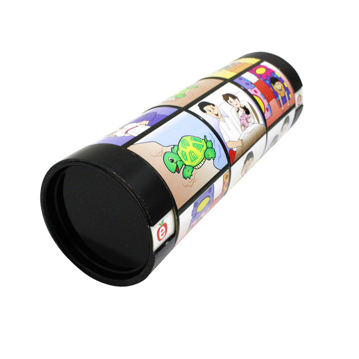El Girógrafo de Secuencias se utiliza para ordenar secuencias en 3 pasos, pueden formar 5 secuencias distintas, poniendo en línea las imágenes respectivas para la secuencia que se quiera armar. Facilita la concentración y la coordinación óculo-manual cilindro impreso a color con alma de tubo de pvc blanco, con elementos de cartón, papel y PVC negro, formando tres secciones giratorias.