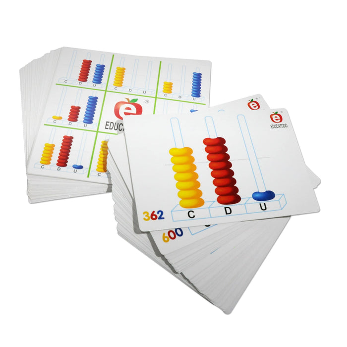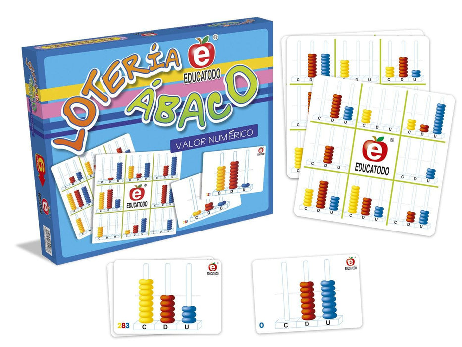 Utilizando esta novedosa Lotería Ábaco Valor Numérico, niñas y niños podrán identificar la organización del sistema de numeración decimal en unidades, decenas y centenas, así como el valor de cada número según la posición que ocupa en un ábaco. Se fomenta la comprensión y aplicación del sistema de numeración decimal.
