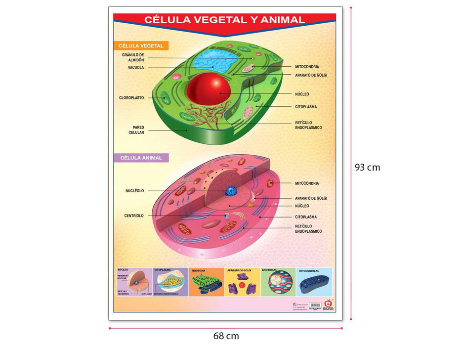 Es un excelente material didáctico, útil para el aprendizaje y/o reforzamiento de la Célula vegetal y Animal. Producto impreso en papel de 1ª clase y plastificado, incluye perchas de plástico autoadheribles para colgarlo.