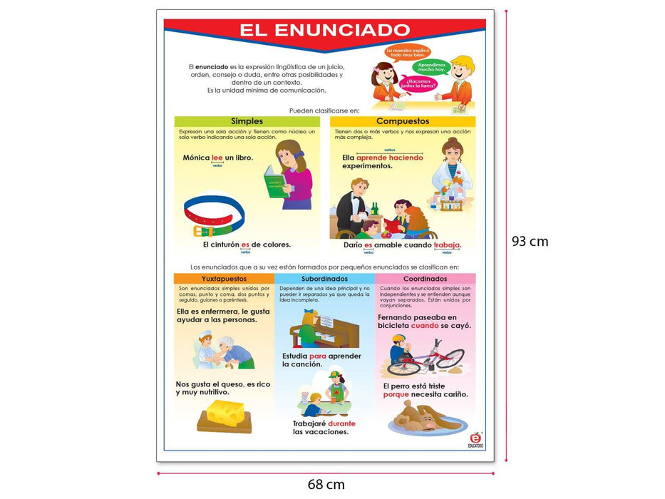 Es un excelente material didáctico, útil para el aprendizaje y/o reforzamiento del Enunciado. Producto impreso en papel de 1ª clase, incluye perchas de plástico autoadheribles para colgarlo.