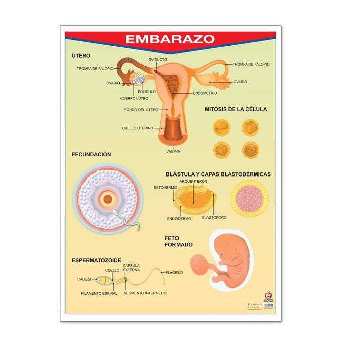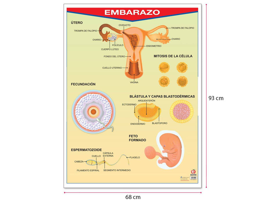 Es un excelente material didáctico, útil para el aprendizaje y/o reforzamiento del Embarazo. Producto impreso en papel de 1ª clase y plastificado, incluye perchas de plástico autoadheribles para colgarlo.