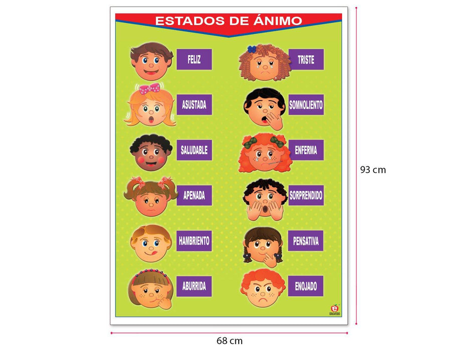 Es un excelente material didáctico, útil para el aprendizaje y/o reforzamiento de los Estados de Ánimo Español/Inglés. Producto impreso en papel de 1ª clase, incluye perchas de plástico autoadheribles para colgarlo.