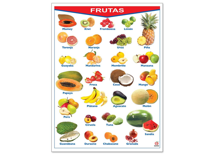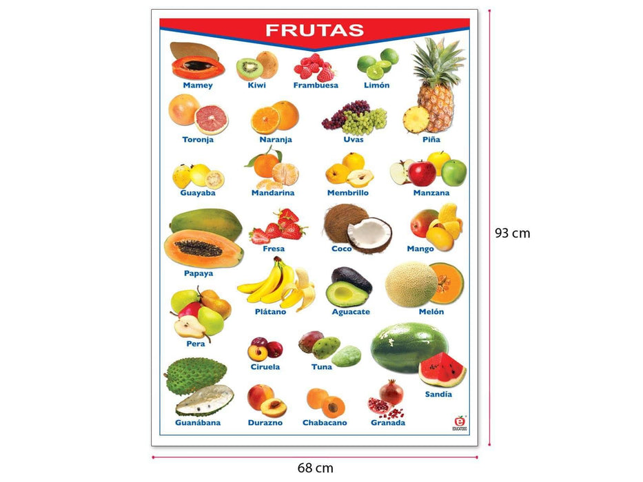Es un excelente material didáctico, útil para el aprendizaje y/o reforzamiento de las Frutas Español/Inglés. Producto impreso en papel de 1ª clase, incluye perchas de plástico autoadheribles para colgarlo.