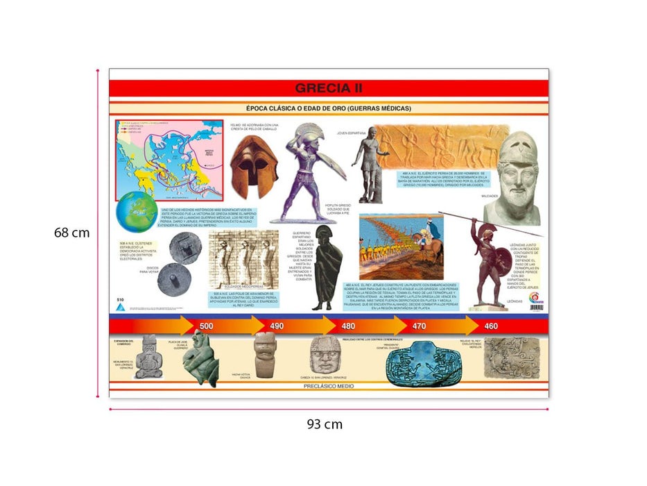 Es un excelente material didáctico, útil para el aprendizaje y/o reforzamiento de la Historia de Grecia. Producto impreso en papel de 1ª clase, incluye perchas de plástico autoadheribles para colgarlo.