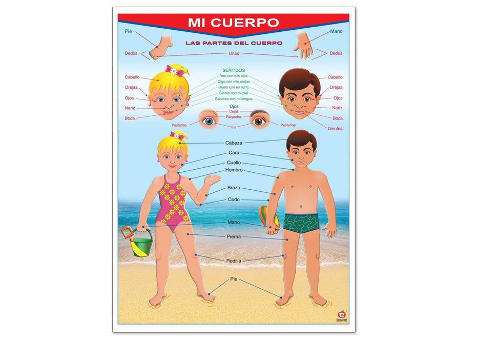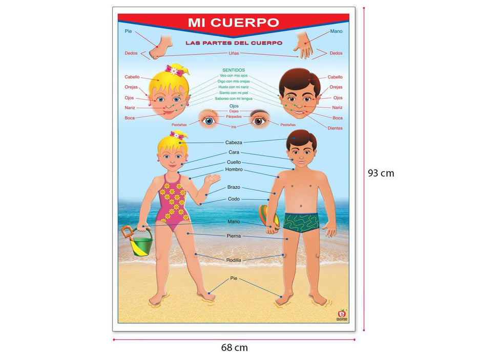 Es un excelente material didáctico, útil para el aprendizaje y/o reforzamiento de Mi Cuerpo/Mi Body. Producto impreso en papel de 1ª clase, incluye perchas de plástico autoadheribles para colgarlo.