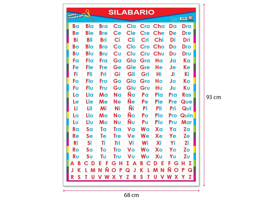 Es un excelente material didáctico, útil para el aprendizaje y/o reforzamiento de las Sílabas. Producto impreso en papel de 1ª clase, incluye perchas de plástico autoadheribles para colgarlo.