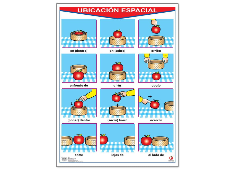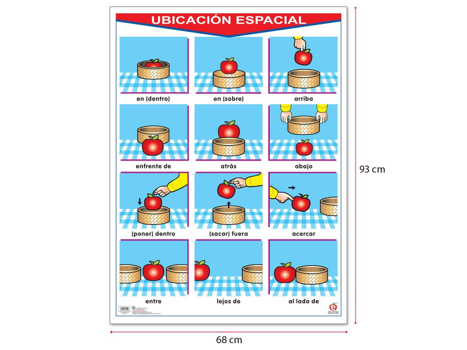 Es un excelente material didáctico, útil para el aprendizaje y/o reforzamiento de la Ubicación Espacial. Producto impreso en papel de 1ª clase, incluye perchas de plástico autoadheribles para colgarlo.