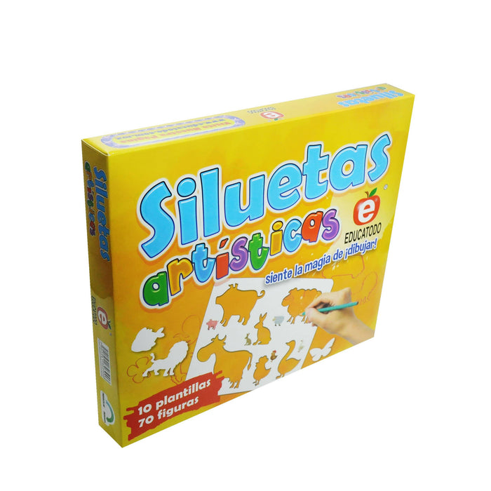 Este juego de Siluetas Artísticas Educatodo facilita que las niñas y los niños dibujen mediante el uso de plantillas y guías de color muchísimas figuras, ya que incluye diferentes tipos de animales, transportes, figuras geométricas, prendas de vestir, flores, hojas, personajes de cuentos, etc. En total son más de 70 posibilidades de trazo y dibujo. Desarrolla la imaginación, la utilización de plantillas, aumenta la capacidad de atención, concentración y la coordinación fina necesaria para la escritura.
