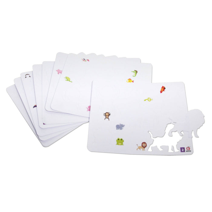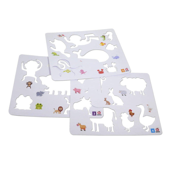 Contiene: 10 plantillas de plástico laminado con medidas de 23.5 x 19 cm, con diferentes temas y figuras del mismo material, incluye guía didáctica. Se presenta en caja de cartón con tapa impresa a todo color plastificada y con medidas de 28 x 24.x 3.5 cm aproximado.