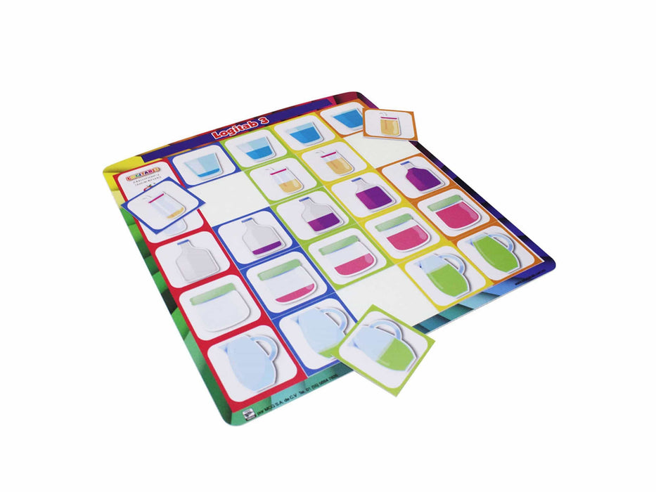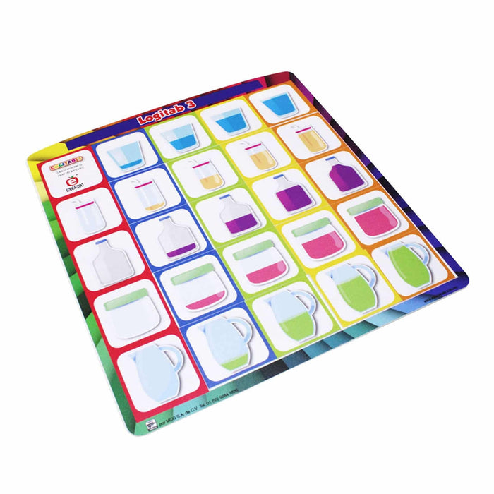 Desarrolla el pensamiento lógico matemático en el Tablero Logitab 3 Niveles de Llenado, utilizando dos variables para ordenar las 25 piezas con los envases y los niveles de llenado. Las piezas están elaboradas en material grado alimenticio e impresas con tintas libres de toxicidad.